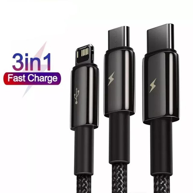 Say goodbye to tangled cords and the hassle of carrying multiple charging cables. This 3-in-1 Fast Charging USB Cable is your all-in-one solution for charging and syncing nearly every device you own. Designed for maximum convenience, it features three connectors in one cable — Lightning, Type-C, and Micro USB — making it compatible with a wide range of smartphones, tablets, and other gadgets.