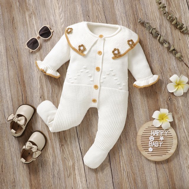 Floral Knit Baby Romper – Long Sleeve Warm Jumpsuit for Girls, 0-9 Months