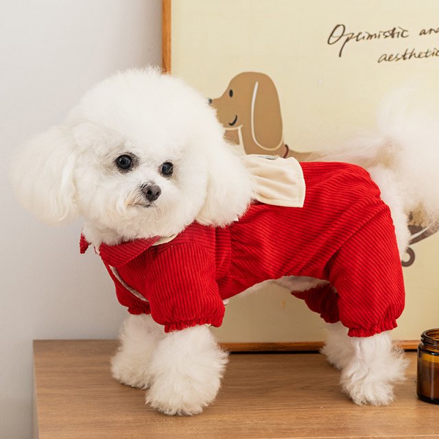 This adorable jumpsuit is not just about looks—it’s crafted for warmth and comfort. The corduroy fabric provides a soft, textured feel, while the thick padding locks in heat. The open-button shirt style makes dressing your dog quick and hassle-free, and the full-leg coverage helps protect from the cold wind. Whether it’s a casual walk in the park, a festive gathering, or a photo-worthy moment at home, your dog will be snug and picture-perfect.